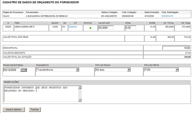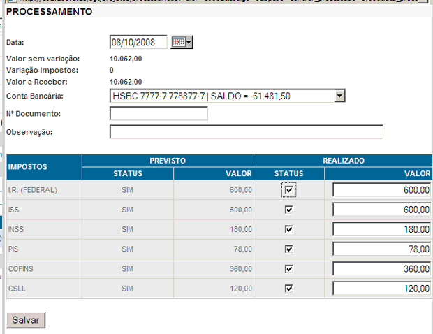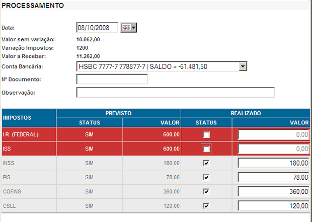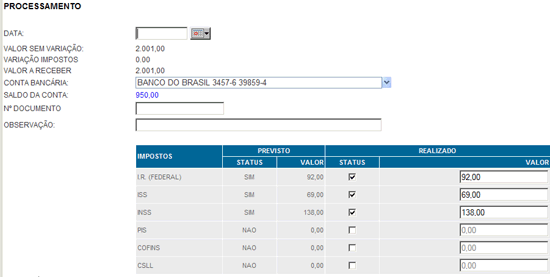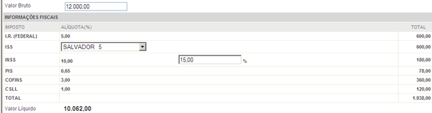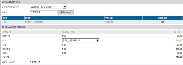 o Na seqüência, o sistema já faz a demonstração dos cálculos, diferenciando assim o valor lançado do valor líquido, como abaixo apresentado:
