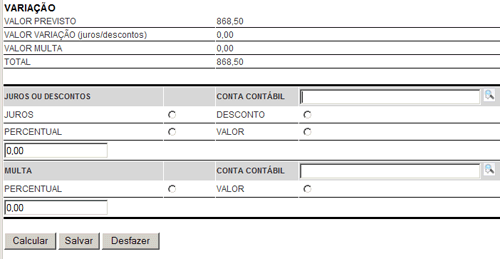 As variações de juros e descontos seguem exatamente a mesma sistemática apresentada para os lançamentos do sistema de contas a pagar. Assim, na coluna variação, ao clicar sobre o botão gerar, nova tela retornará para que o usuário faca as configurações nos valores. |