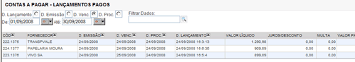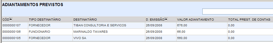 A partir do Menu: Controladoria, Financeiro, Adiantamentos, Lançamentos Previstos. O sistema retorna a listagem dos adiantamentos previstos, ou seja, são os lançamentos que estão programados e, ainda, não fizeram a baixa na conta corrente. Conforme lista apresentada abaixo: