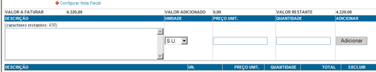 A configuração de notas fiscais para a impressão pode ser feita diretamente na tela do lançamento. O usuário informa os dados de descrição dos serviços e valores que, aproveitando os dados já lançados no título a receber, definirão de forma adequada os campos que precisão ser impressos. |