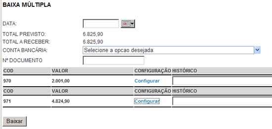 Como citado na parte de contas a pagar, a baixa múltipla tem por objetivo realizar um único lançamento no extrato bancário na conta no sistema, seguindo o mesmo histórico do extrato bancário no banco. Para realizar a baixa múltipla, é necessário fazer previamente a seleção dos lançamentos que serão baixados, assim o sistema vai totalizando à medida em que os registros vão sendo selecionados, dando o valor final para a baixa múltipla que será realizada. Após fazer a seleção dos registros, deve o usuário clicar no botão Realizar Baixa, com isso o sistema retorna nova tela para a inserção da configuração dos dados de baixa. É preciso considerar que aqui também é aplicável a questão da confirmação dos impostos previstos. Neste caso, há uma peculiaridade, pois o sistema trata de forma isolada cada lançamento, então o usuário deve fazer as configurações devidas para confirmar a operação, conforme apresentado na tela em seguida: