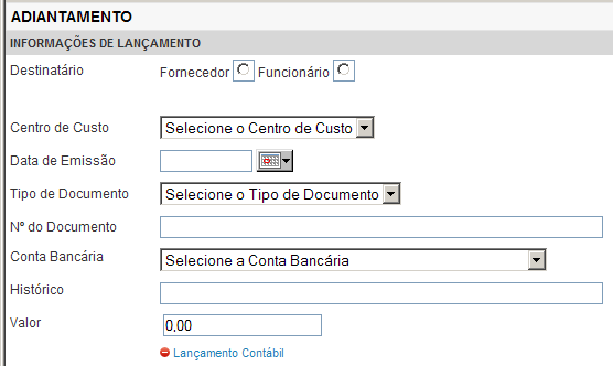 § Destinatário: o usuário tem 2 opções para realizar um adiantamento, que pode ser Fornecedor ou Funcionário. Ao marcar a opção desejada, o sistema irá exibir o campo para a seleção do fornecedor ou funcionário. § Centro de Custo: informar para qual centro de custo deverá ser alocado o adiantamento. § Data de Emissão: informa a data de emissão do adiantamento. § Tipo de Documento: qual é o tipo de documento que será utilizado para manter o registro impresso do adiantamento realizado, assim o solicitante poderá assinar e manter armazenado em pasta. § Número do Documento: código que identifica o tipo de documento utilizado e impresso. § Conta Bancária: define a origem do recurso, o usuário deve informar a conta que dará saída ao valor do adiantamento. §