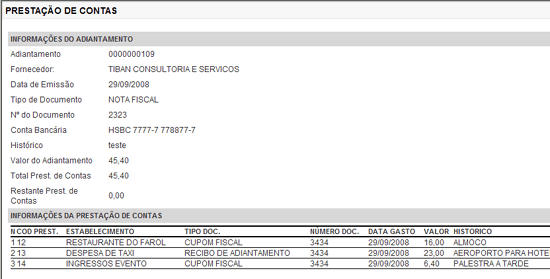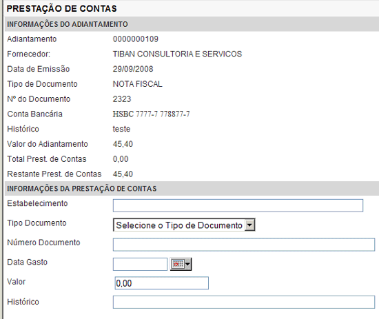 Através da lista de adiamentos baixados, o usuário deve no lançamento desejado clicar sobre o botão que indica a realização da prestação de contas. Prestar conta significa que o destinatário do adiantamento irá apresentar recibos de gastos ou notas, informando o as contas pagas com o valor do adiantamento. Ao acessar a prestação de contas, o sistema retorna uma tela detalhada para que o usuário possa informar os dados dos gastos, fazendo assim os lançamentos, conforme abaixo apresentado: