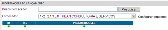 A PAGAR § Quando um lançamento é feito na tela de contas a pagar e o fornecedor está configurado para sofrer retenções, a ser baixado, este lançamento irá gerar um imposto pendente, pois, em se tratando de prestação de serviços com pessoa jurídica, os impostos são retidos na fonte. o Na tela de contas a pagar, é selecionado o fornecedor de serviços com incidência de impostos: