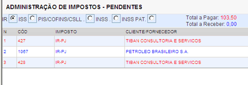 o Este lançamento deverá ser salvo e, em seguida, baixado. Quando isso ocorrer. Ficará registrado na parte de controle de impostos, as retenções feitas, onde, por imposto, o usuário poderá fazer a seleção para gerar uma nova obrigação de pagamento oriunda, desta vez, de impostos pendentes, como abaixo apresentado: