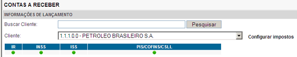 A RECEBER § A outra situação é quando um lançamento é feito na tela de contas a receber. Após a baixa do lançamento, não havendo compatibilidade das retenções programadas e realizadas, o sistema aplicará a regra que passa para a parte de controle de impostos. o Na tela de contas a receber, é selecionado o cliente que contém configurações para a incidência de impostos: